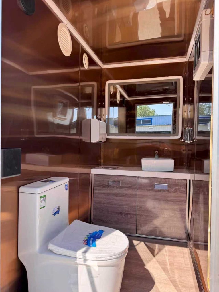 A warm, luxurious glow that feels more like a boutique hotel suite than a bathroom trailer.